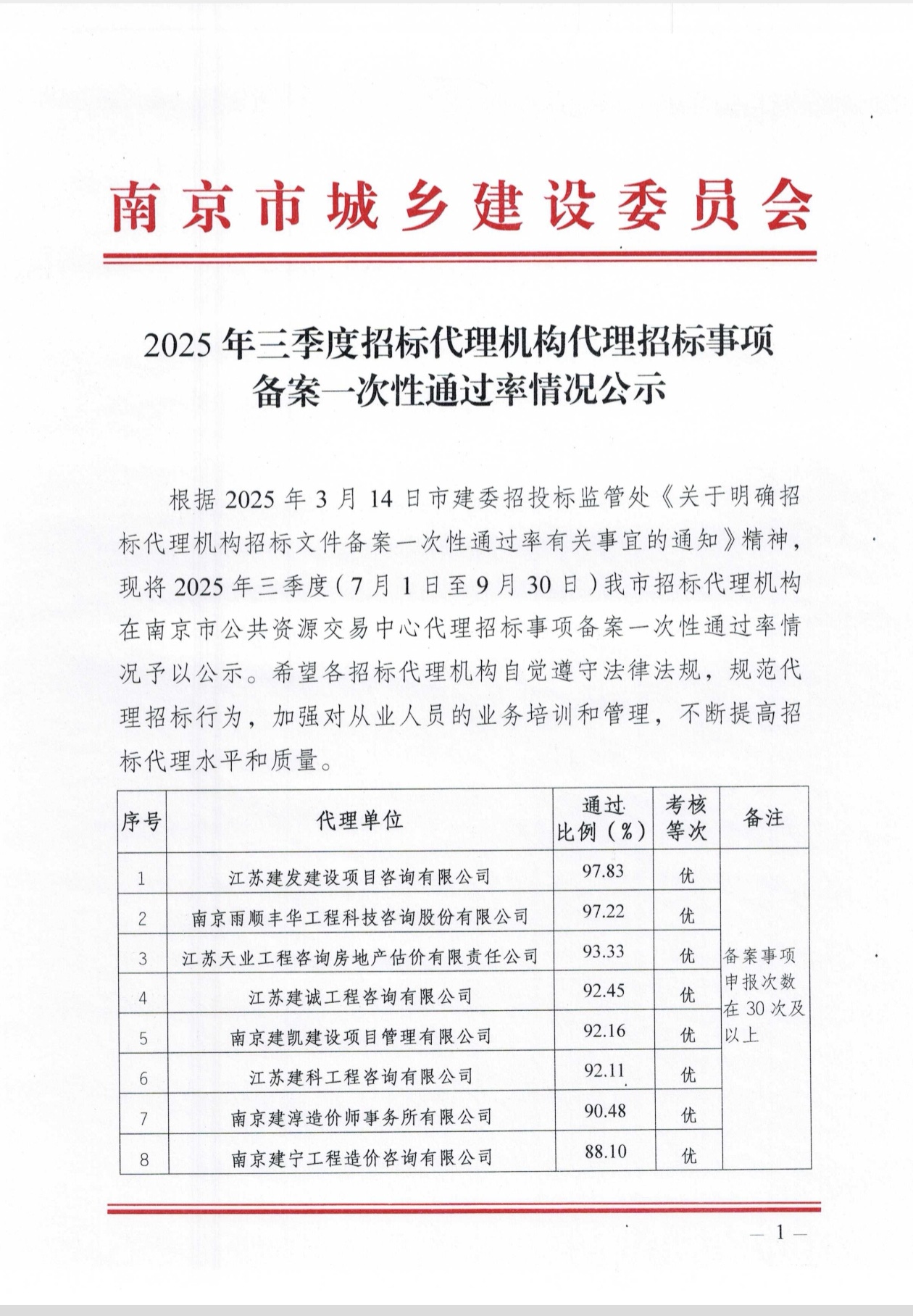 2025年三季度招标代理机构代理招标事项备案一次性通过率情况公示