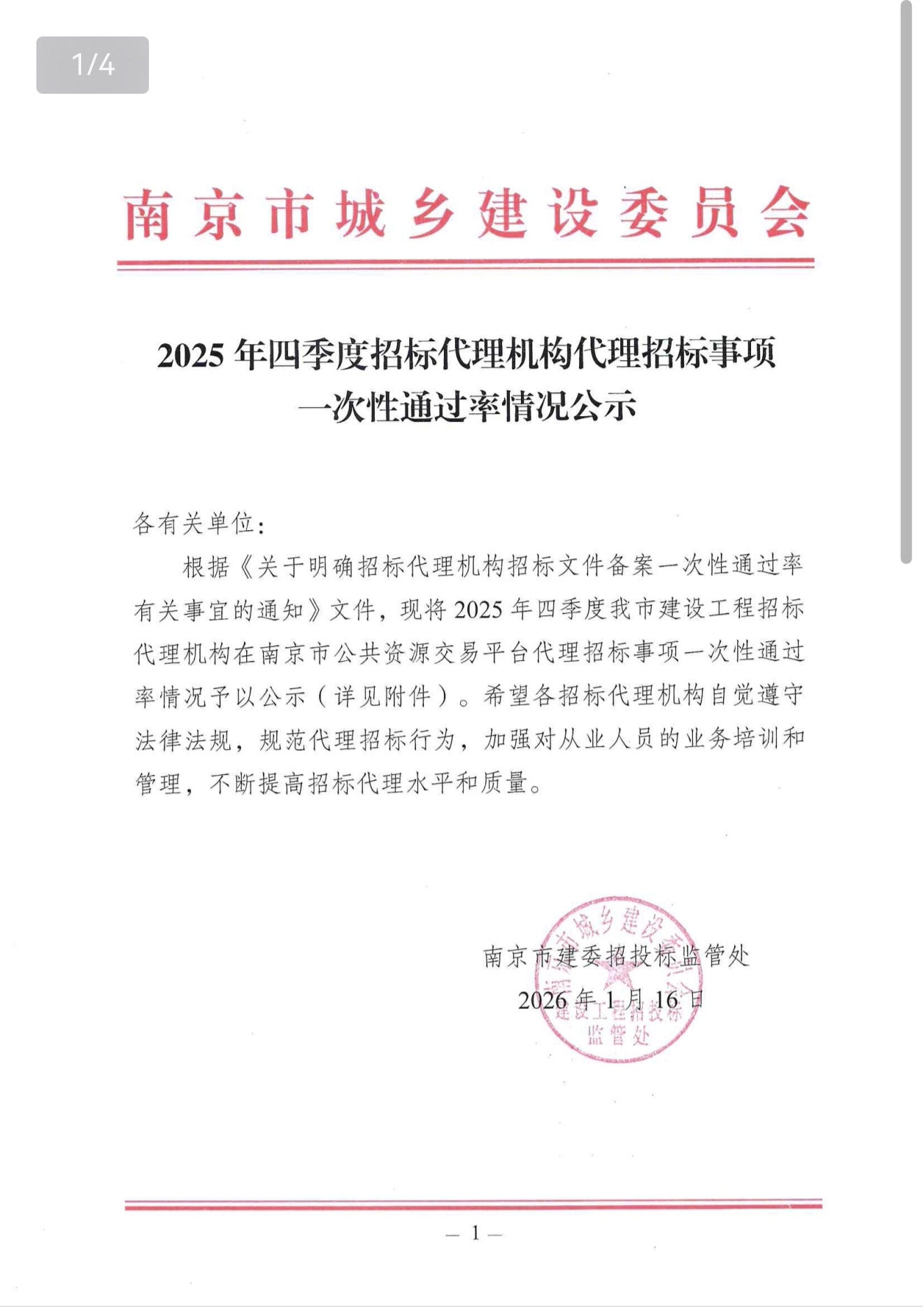 2025年四季度招标代理机构代理招标事项一次性通过率情况公示